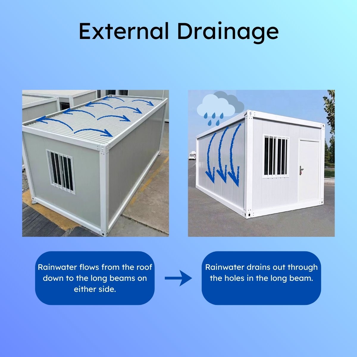 - Upgraded polyurethane foam sandwich panel: more excellent heat insulation and heat preservation performance, no water absorption, no rot, no fear of fire.